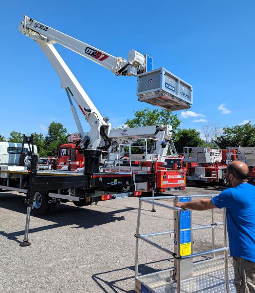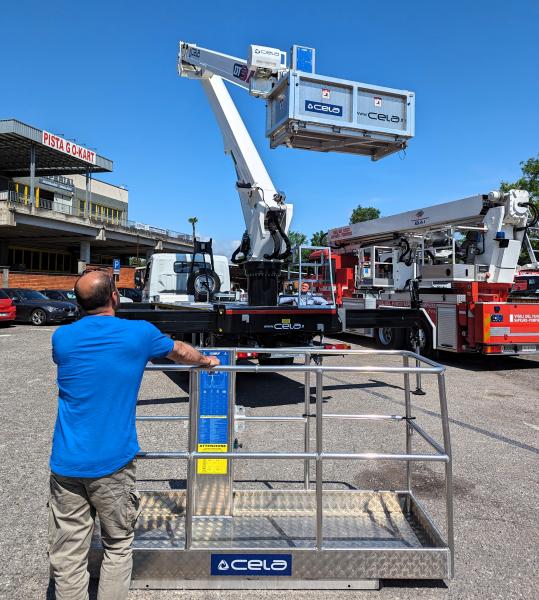 Altezza massima di lavoro mt. 37; Altezza piano di calpestio mt. 35. Sbraccio massimo di lavoro con traverse estese mt. 19. Rotazione torretta 1140, Rotazione idraulica cesto 85°+85°; Portata massima nel cesto kg. 450; Dimensioni cesto mm. 2000x700x1100. Installazione su veicoli aventi PTT 7,5 ton. Minimo. Comandi Elettronici. Piattaforma di lavoro aereo con doppio braccio telescopico con comandi elettroidraulici proporzionali compensati Cestello in alluminio a smontaggio rapido da 2000 x 700 x h. 1100 mm. Cestello con portata massima di 450 kg.; Comando avvio/arresto motore dal cestello;Comando dal cestello per segnalatore acustico. Comandi elettroidraulici proporzionali a gestione elettronica. Connessione elettrica 230V nel cesto. Contaore elettrico collegato alla PTO. Controllo anticollisione tra bracci e cabina del veicolo. Dispositivo di stabilizzazione automatica. Impianto idraulico a filtraggio differenziato con filtri ad alta efficienza. Pompa di emergenza manuale. Rotazione cestello ±85°. Rotazione torretta 1440°. Sistema di comando e controllo in CAN BUS ; Sistema multi assale per controllo visivo stabilizzazione. Teleassistenza remota tramite nuovo sistema Cela Remote Service System CRSS. Traverse anteriori e posteriori estensibili idraulicamente. Valvole di blocco flangiate sui cilindri. Verniciatura parte bracci e rinvii telescopici: Blu RAL 5013 oppure Bianco RAL 9010. Verniciatura cilindri, torretta e bielle RAL 9010. Verniciatura telaio Blu RAL 5013 oppure Nero. Corso di addestramento all’uso. Documentazione idonea per sbarco in quota