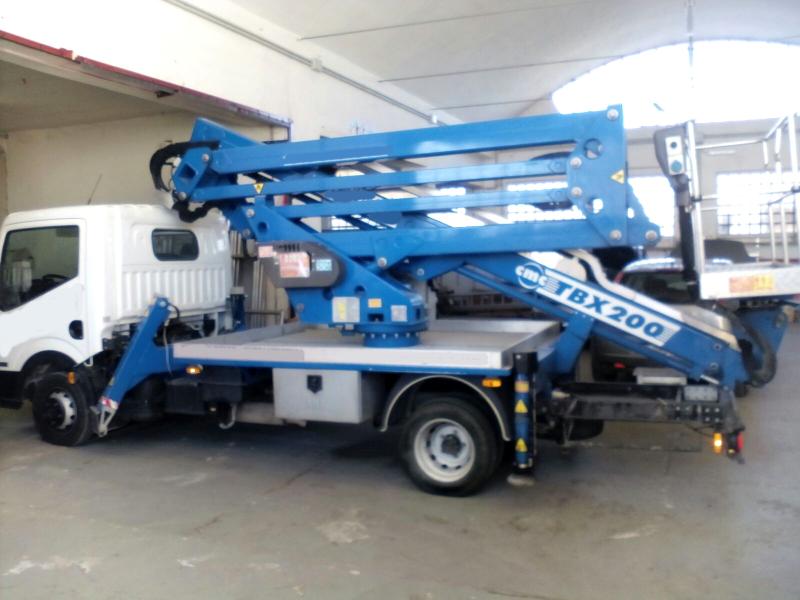 Le piattaforme autocarrate usate CMC TBX200 su Nissan Cabstar sono piattaforme montate su camion che permettono di lavorare fino a 20m di altezza, sbraccio 9m.